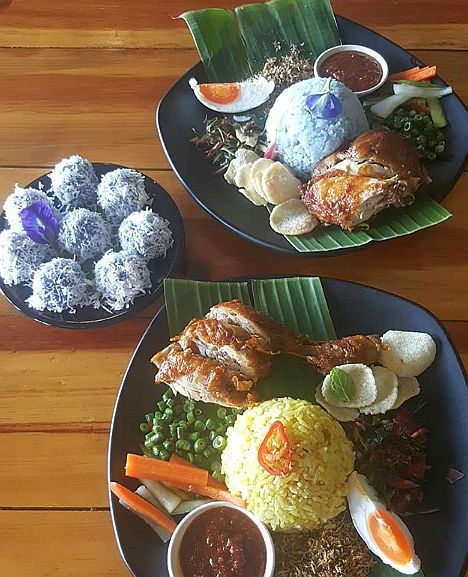 As for yesterday, we have enjoyed a bit of the Nyonya “nasi kerabu” (bluish tint rice) and “kuih”, plus syrup blue (looks more like purple) drink.